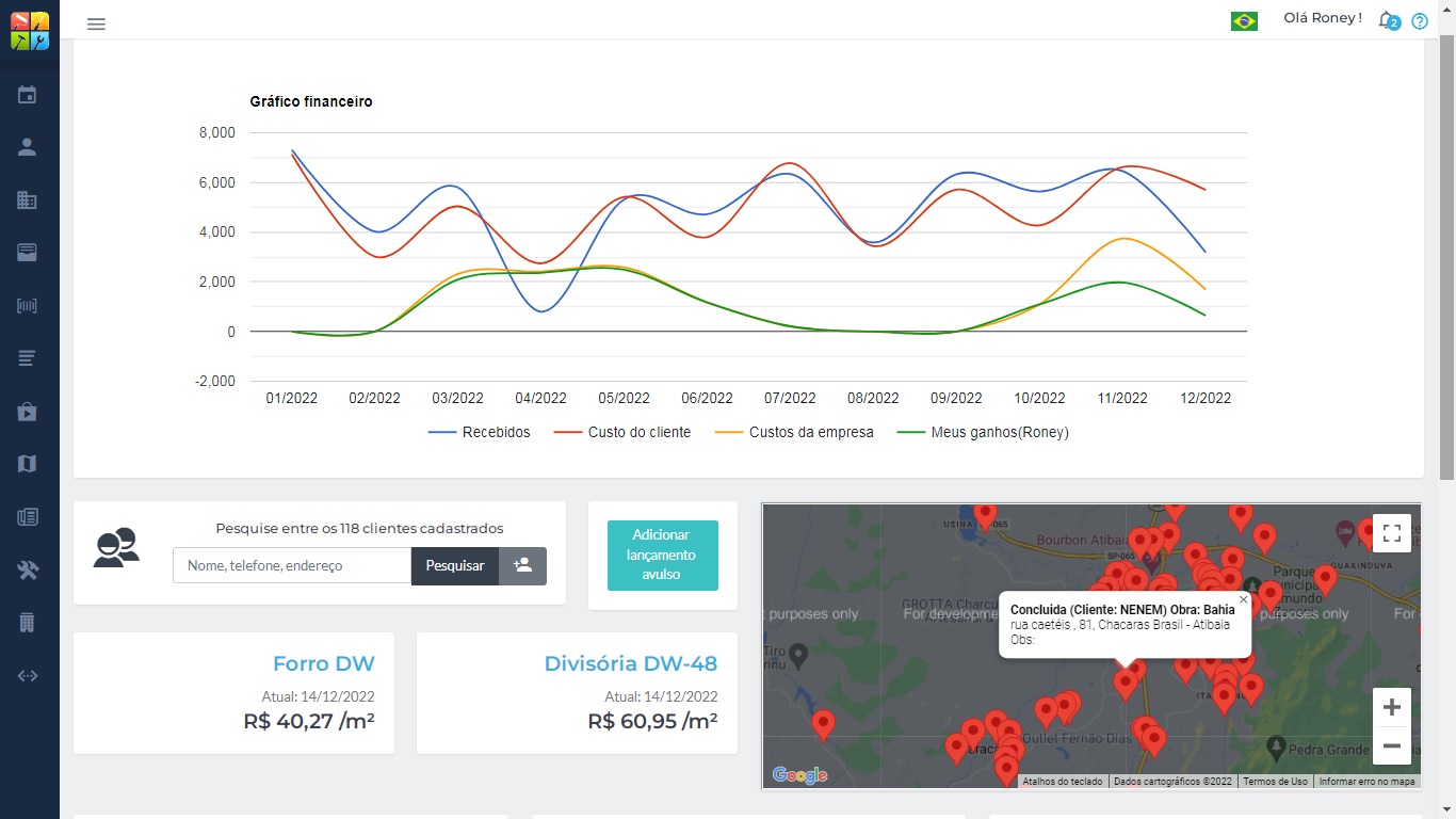 Todos os seu clientes tem uma página para acompanhar os custos e arquivos das obras.